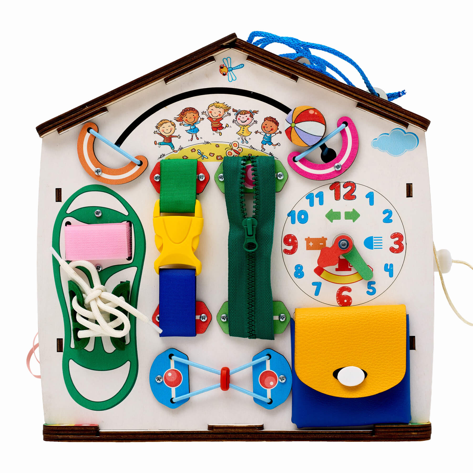 Вверху находится игра «Рогатка»: мячиком можно «стрелять» по определенной траектории из рогатки в элемент с резинкой и обратно. Такая игра укрепляет мышцы обеих рук. А еще в нее могут играть два малыша одновременно. В центральной части поля расположены основные элементы одежды: поясной замок, классическая молния, кармашек с кнопкой и кроссовок с липучкой и шнуровкой. Все они помогают ребенку уже к 3 годам научиться самостоятельно одеваться и обуваться. А в нижней части есть ящик-тайничок для хранения частей сортера, наклеек и любимых маленьких игрушек.